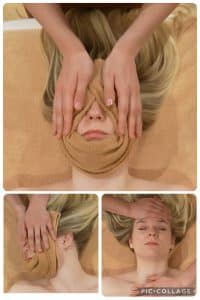 De hoofdhuidmassage vermindert spanning, oormassage kalmeert het zenuwstelsel.